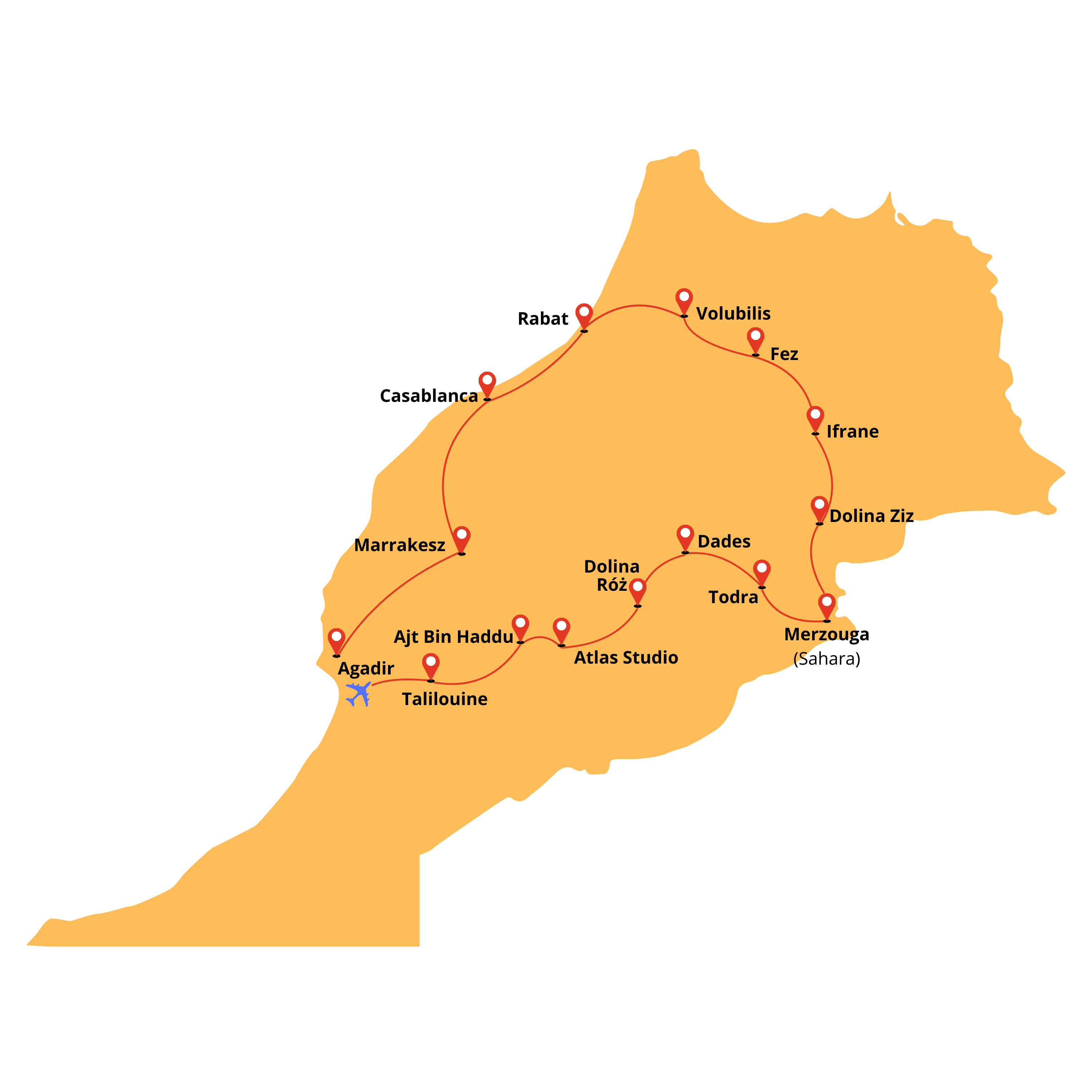 Odbierzemy wszystkich uczestników wyjazdu przylatujących na lotnisko w Agadirze, skąd ruszymy bezpośrednio w trasę. Noc spędzimy w hotelu za miastem, dzięki czemu skrócimy czas jazdy kolejnego dnia.